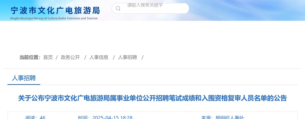 原标题:关于公布宁波市文化广电旅游局属事业单位公开招聘笔试成绩和入围资格复审人员名单的公告