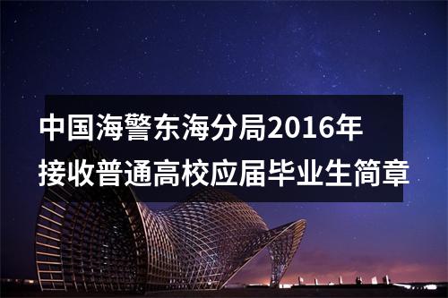 2016年海警东海分局接收大学生入警考试公告。供广大公安现役考生参考。中公教育方便广大公安现役考生及时了解信息,及时发布公安现役部队接受高校毕业生相关信息。加入2016公安现役交流群485908319,了解更多信息。中国海警东海分局2016年接收普通高校应届毕业生简章